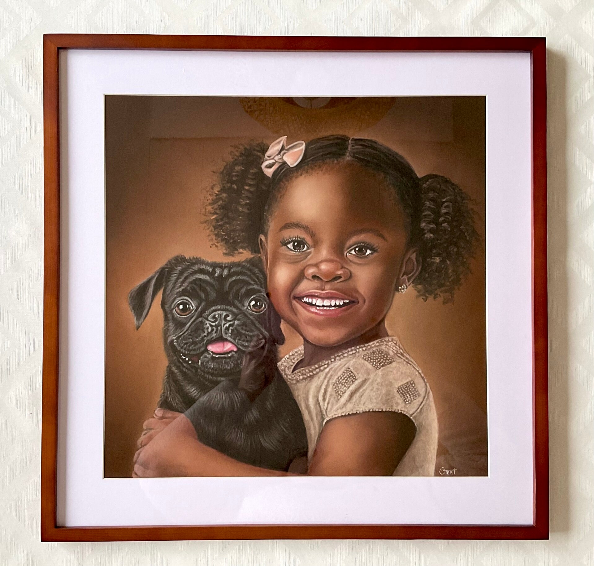De originele pasteltekening 40x40cm, netjes ingelijst in een bruine lijst van 50x50cm met witte passe-partout