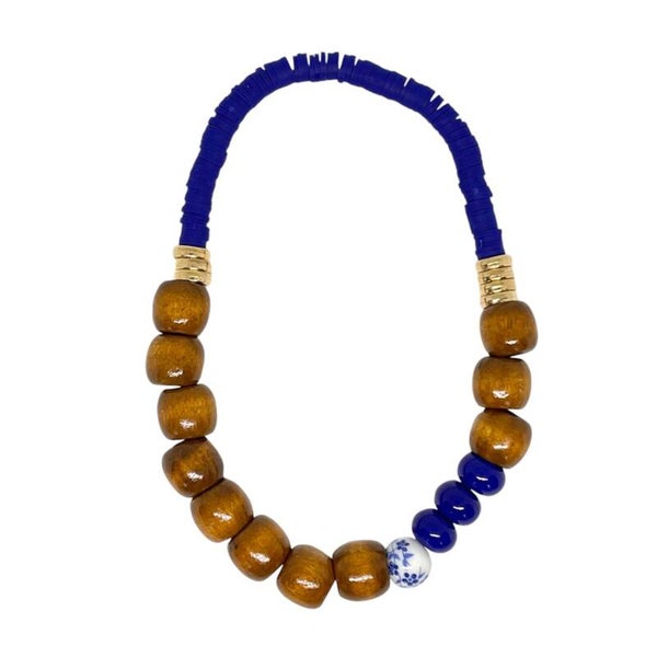 Armband met Delfts blauw, donkerblauw, bruinhouten en goud tinten