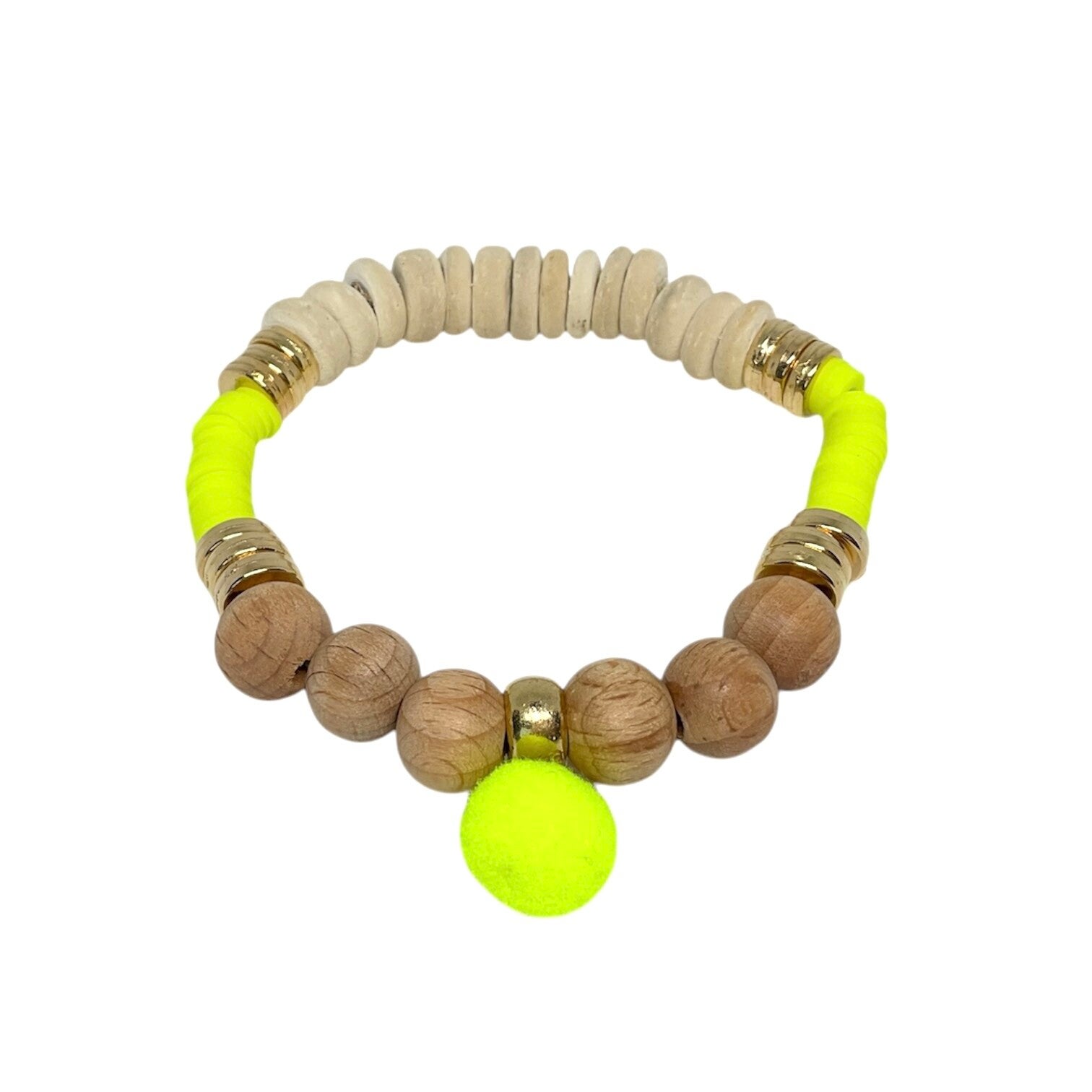 Sierketting met fluo gele, bruinhouten, ecru en goud tinten